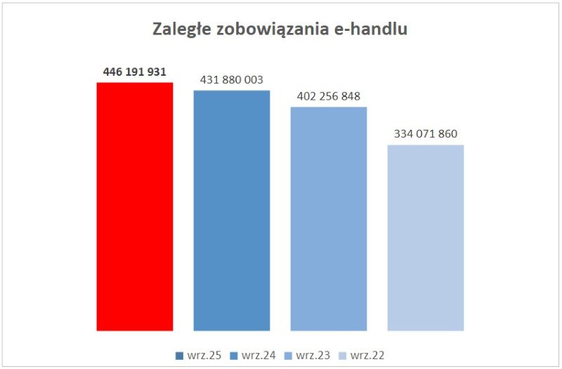 • W tym samym czasie przeterminowane zadłużenie e-commerce (PKD 4791Z) wzrosło o ponad 14 mln zł do 446,2 mln zł i aż o 112 mln zł od września 2022 roku.